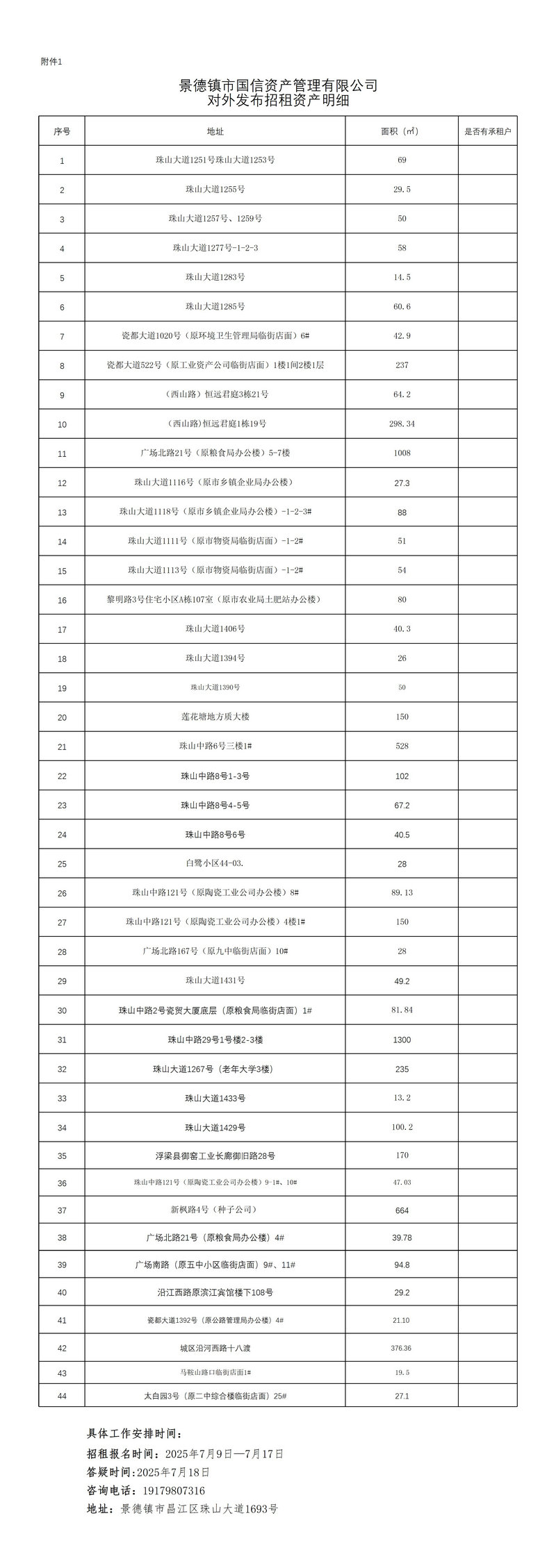 一、資產(chǎn)基本信息:現位于瓷都大道、廣場(chǎng)北路、珠山中路、珠山大道等地址資產(chǎn)進(jìn)行公開(kāi)招租。具體招租標的物信息面積詳見(jiàn)《招租清單》